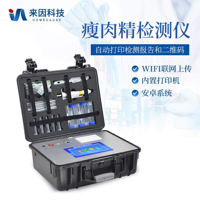 瘦肉精检测仪可现场快速检测盐酸克伦特罗、莱克多巴胺、沙丁胺醇、己烯雌酚、喹乙醇等。仪器预留其他项目检测程序和端口,根据日后需求可方便的自主增加检测项目。日后可升级为检测抗生素、兽药残留、动物疫病、病害肉、的综合类型仪器。