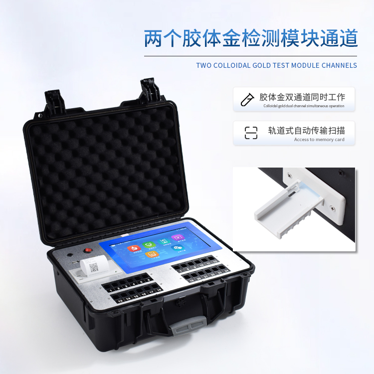 3、两个胶体金检测模块通道,胶体金双通道可同时工作,在同一界面显示,轨道式自动传输扫描,检测完成后自动退出检测卡。