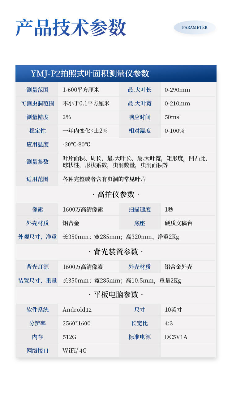YMJ-P2拍照式叶面积仪(平板版)由图像采集设备和图像处理软件组成,采用本公司新开发的图像识别软件,根据叶片轮廓特征提取、图形实物转换、边缘检测等技术,能够形象并快速得到所测叶片面积、周长、虫洞数量等参数,并且可以将叶片分段测量,系统会自动合并两张图片并综合分析各参数。相比传统的叶面积,具有测量更快速简便、结果更形象客观、数据多样并大大减少了人为操作带来的误差。