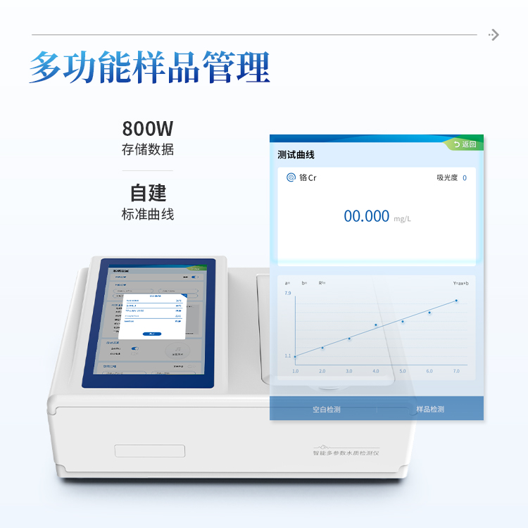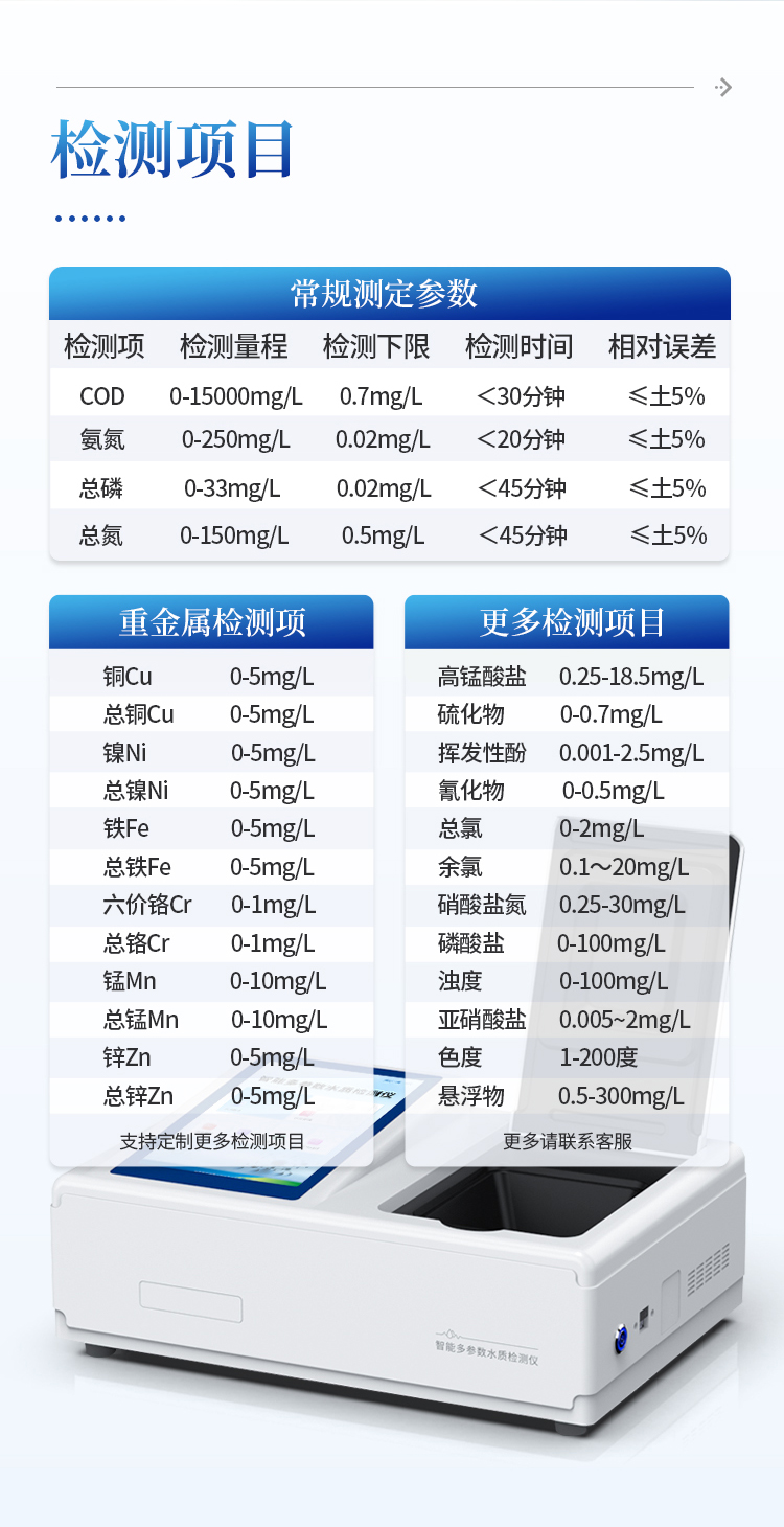 多参数水质重金属检测仪是完全参考国家标准、环境标准等相关标准设计制造,适用于国内外众多检测标准。主要检测水质六价铬、总铬、铅、镉、汞、砷、铜、总铜、锌、总锌、铁、总铁、镍、总镍、锰、总锰、钛、钒、银、铝、锡、铍、钡、锑、钴等重金属含量指标;本仪器兼具智能数据分析功能,图表、列表显示数据,分析一目了然;高清晰度彩色液晶触摸显示屏,Android智能操作系统,中文显示界面,中英文键盘,人性化操作,使用更简单。