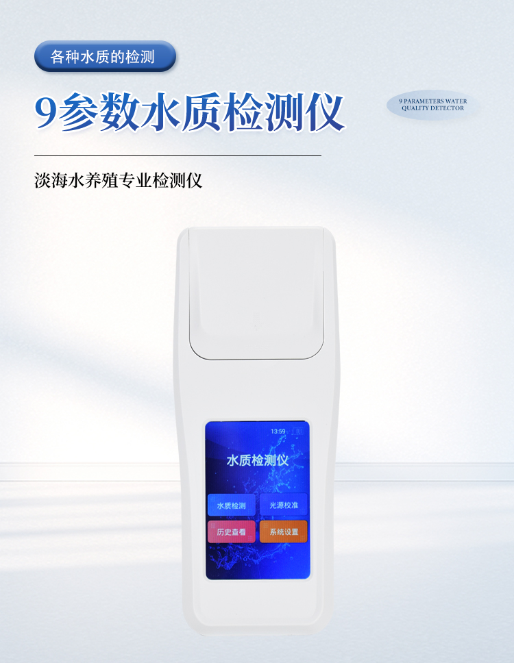 可检测PH、溶解氧、氨氮、亚硝酸盐、总碱度、硫化氢、盐度、磷酸盐、总硬度9项指标;